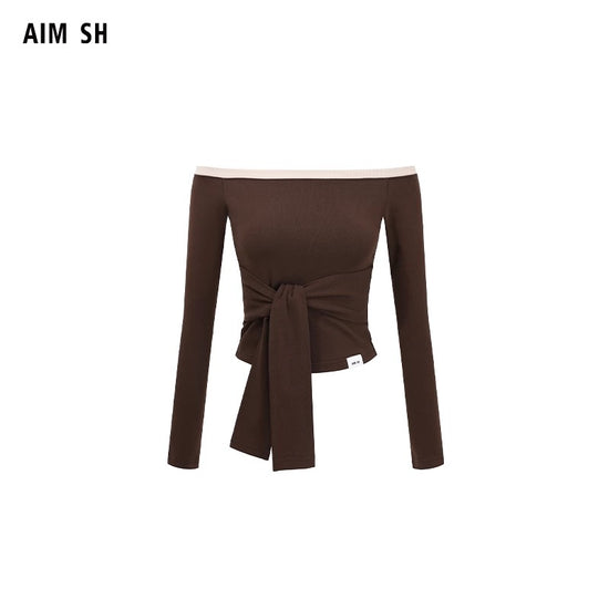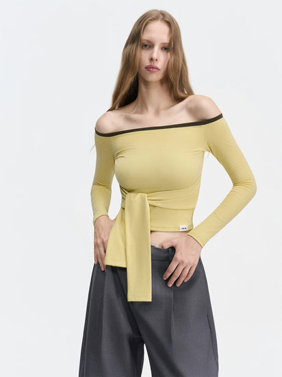 Contrast-Color Off-Shoulder Knotted Waist Fitted Top